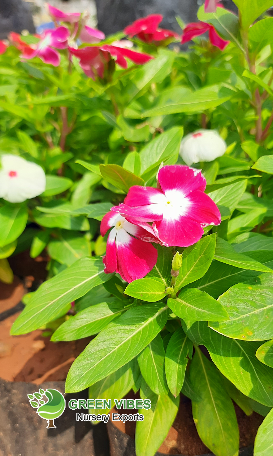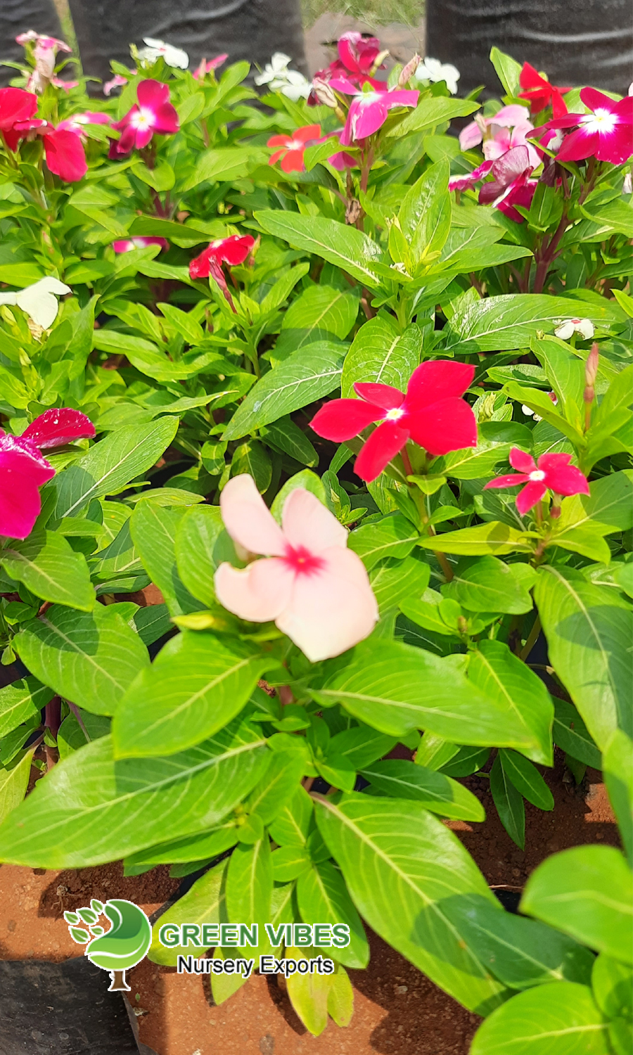 Catharanthus Roseus commonly known as the Madagascar periwinkle,Rose periwinkle or Rosy periwinkle.Flowers in many shades of Pink,Red,Lilac and white or in light shades with dark throats.