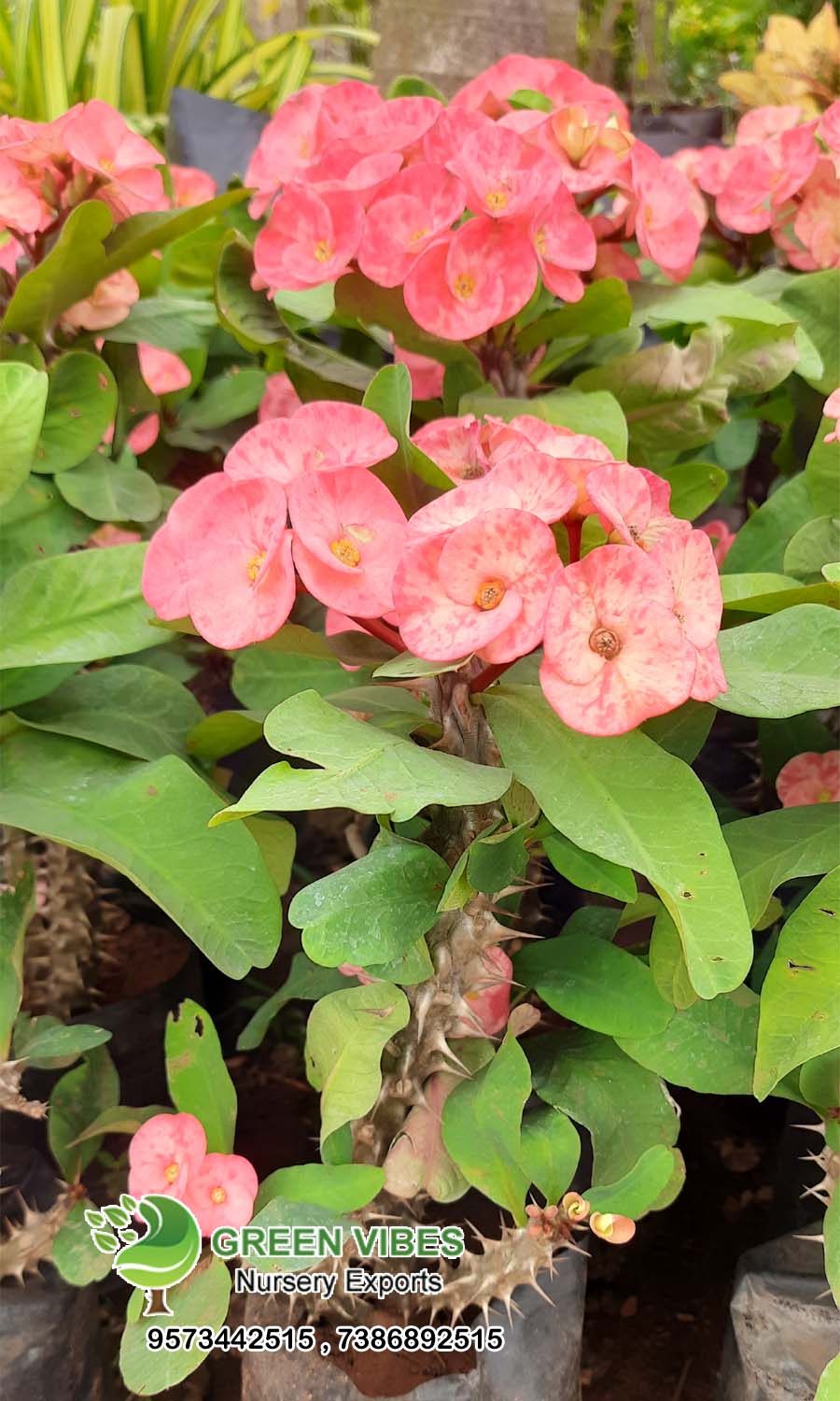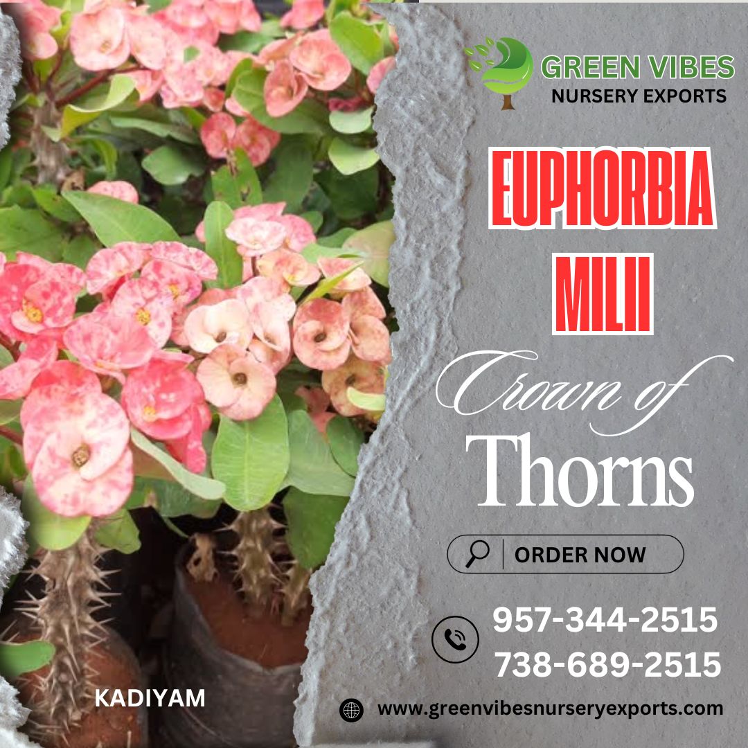 Euphorbia Milii - Crown of Thorns is a deciduous, herbaceous, perennial shrub with bright green leaves and greenish flowers. The flowers are enclosed within long-lasting and bright bracts of red or yellow. The plant is loose in form, spiny and irregularly shaped, with thick, black spines and its historic presence in the Middle East led to the belief by some that the stems of this plant had been used in Christ's crown of thorns, hence the common name