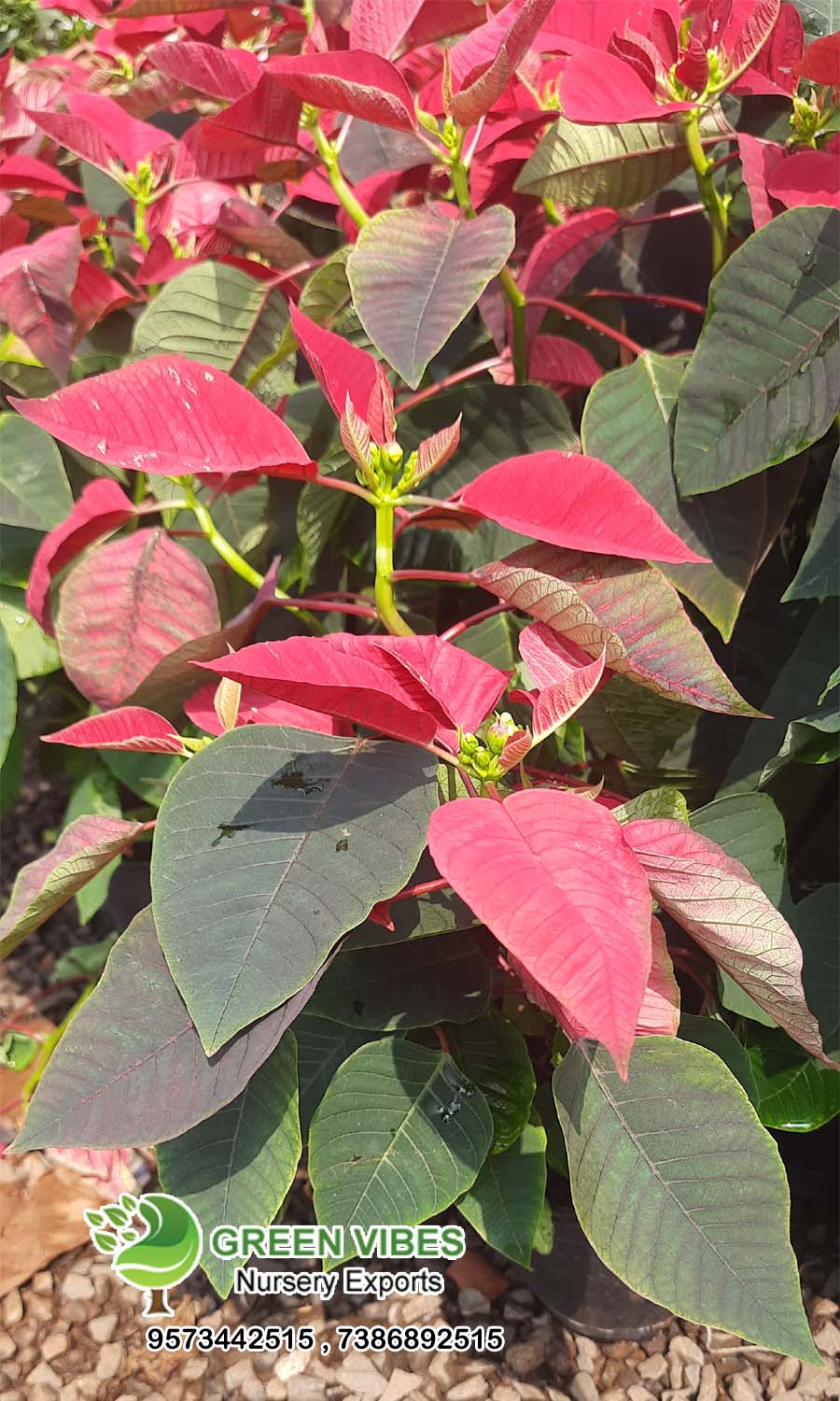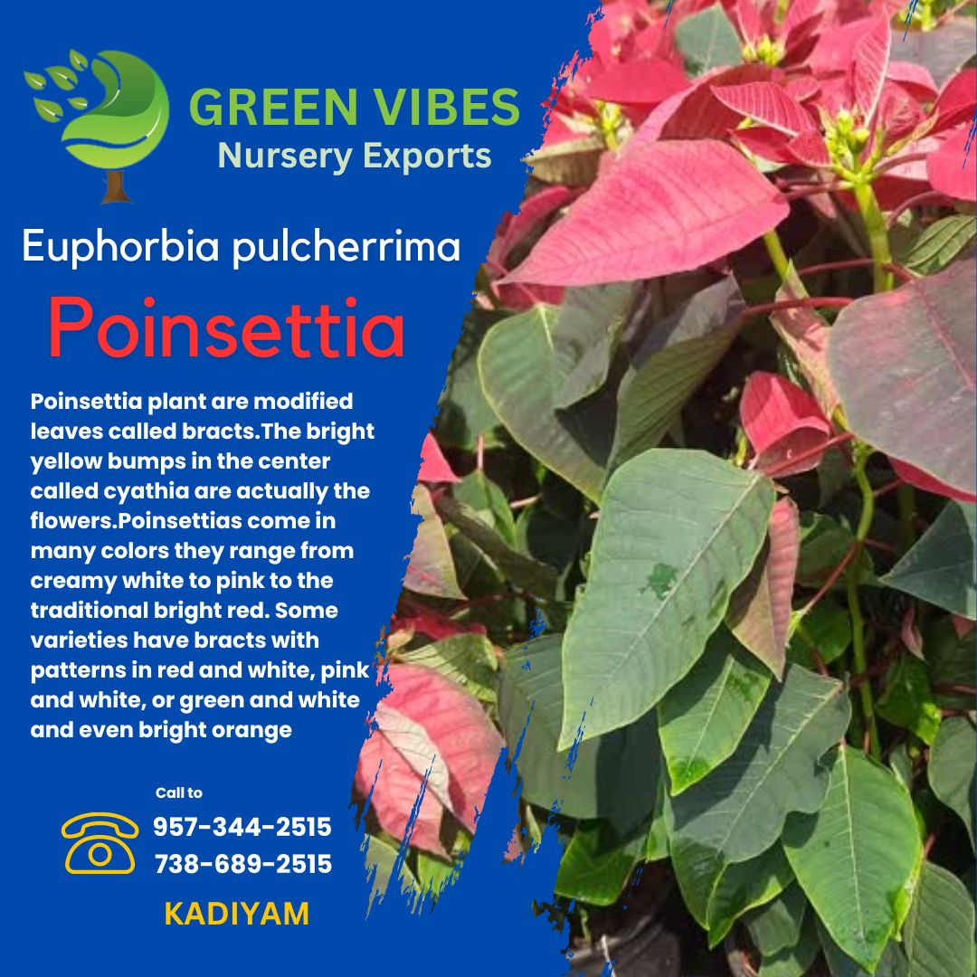 Euphorbia Pulcherrima (Poinsettia) Plant are modified leaves called bracts.The bright yellow bumps in the center called cyathia are actually the flowers.Poinsettia come in many colors they range from creamy white to pink to the traditional bright red.Some varieties have bracts with patterns in red and white,pink and white, or green and white and even bright orange.