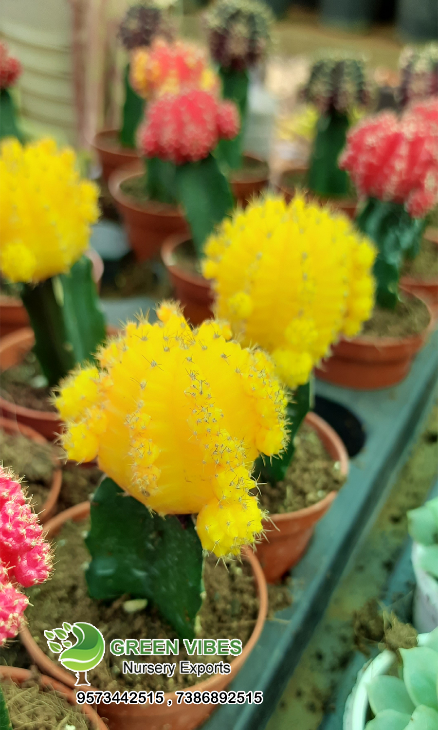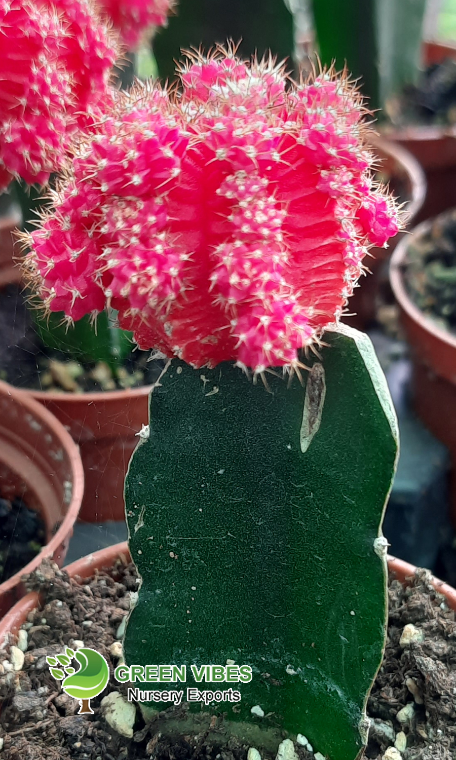 Moon cactus are commonly grown as houseplants and are also known as Ruby Ball,Red Cap,Red Hibotan,or Hibotan cacti,Gymnocalycium mihanovichii.Moon Cactus it requires bright indirect Sun Light, but only needs to be watered when dry.Comes in attractive colors like Red,Orange,Yellow,Pink.