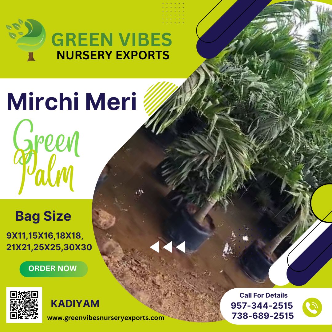 Mirchi Meri Green Palm can grow upto 8 feet in height, growing fast in full sun, the plant is tolerant of both sunny and shady conditions.Its smooth gray trunk is topped with a bright green crown shaft and big tufted fronds.