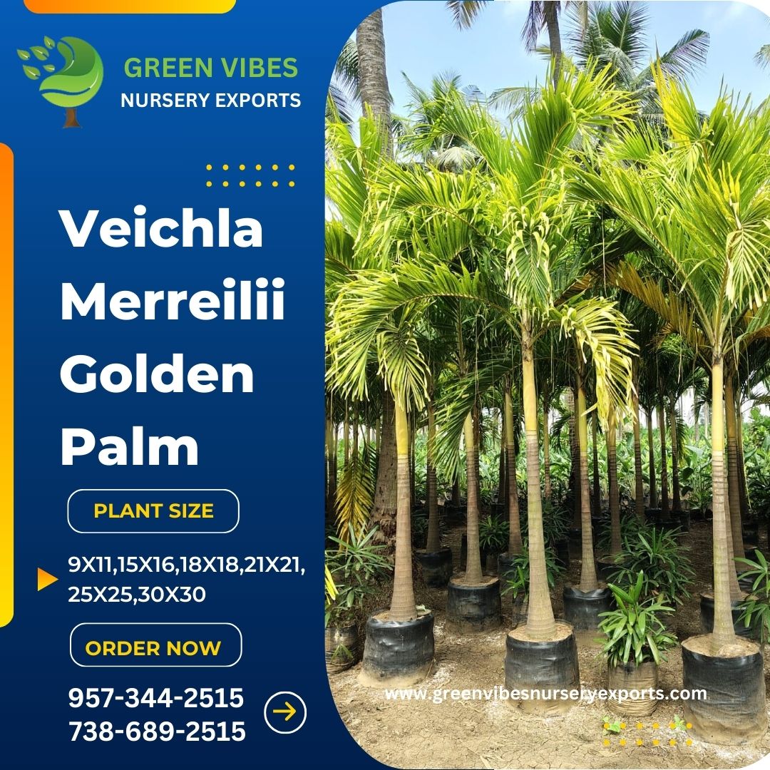 Golden Veitchia Merreilii palm also known as the Golden Christmas palm .single-trunked palm with stiffly arched, six-foot-long, bright green fronds is noted for the fall and winter appearance.